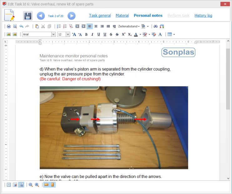 Alle notwendigen Informationen wie Zeichnungen, Fotos und Videos können als Anhang zu den Aufgaben hinzugefügt werden. Zusammen mit den umfangreichen Druckfunktionen ist der Wartungsmonitor eine perfekte Basis für Ihr Servicepersonal.